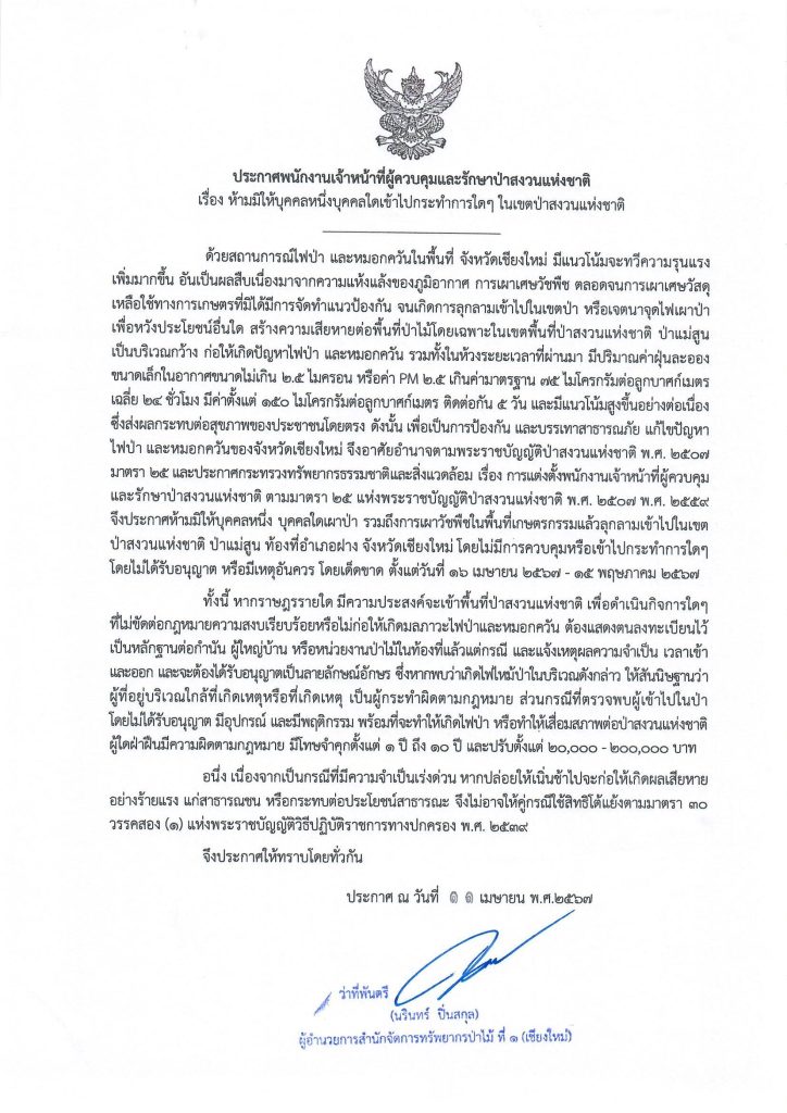 ประกาศพนักงานเจ้าหน้าที่ผู้ควบคุมและรักษาป่าสงวนแห่งชาติ11 เมษายน 2024 ใน ประกาศ by adminir เรื่่อง ห้ามมิให้บุคคลหนึ่งบุคคลใดเข้าไปกระทำการใดๆ ในเขตป่าสงวนแห่งชาติ