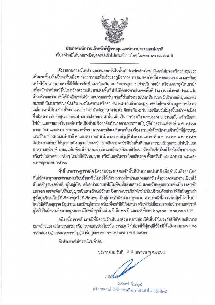 ประกาศพนักงานเจ้าหน้าที่ผู้ควบคุมและรักษาป่าสงวนแห่งชาติ11 เมษายน 2024 ใน ประกาศ by adminir เรื่่อง ห้ามมิให้บุคคลหนึ่งบุคคลใดเข้าไปกระทำการใดๆ ในเขตป่าสงวนแห่งชาติ