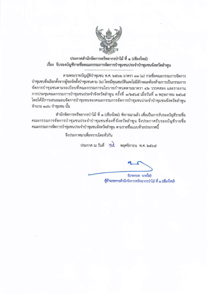 ประกาศสำนักจัดการทรัพยากรป่าไม้ ที่ ๑ (เชียงใหม่) เรื่อง รับรองบัญชีรายชื่อคณะกรรมการจัดการป่าชุมชนประจำป่าชุมชนจังหวัดลำพูน14 พฤศจิกายน 2022 ใน ประกาศ by adminir
