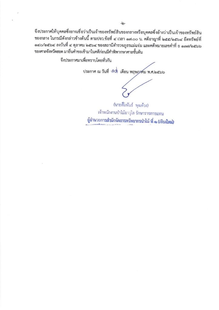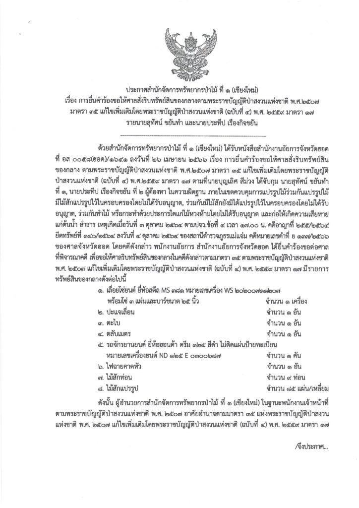 หน้าแรก » ประกาศ » ประกาศสำนักจัดการทรัพยากรป่าไม้ ที่ ๑ (เชียงใหม่) เรื่อง การยื่นคำร้องขอให้ศาลสั่งริบทรัพย์สินของกลางตามพระราชบัญญัติป่าสงวนแห่งชาติ พ.ศ.๒๕๐๗ มาตรา ๓๕ แก้ไขเพิ่มเติมโดยพระราชบัญญัติป่าสงวนแห่งชาติ (ฉบับที่ ๔) พ.ศ. ๒๕๕๙ มาตรา ๑๗ รายนายสุทัศน์ ขยันทำ และนายประทีป เรืองกิจขยัน