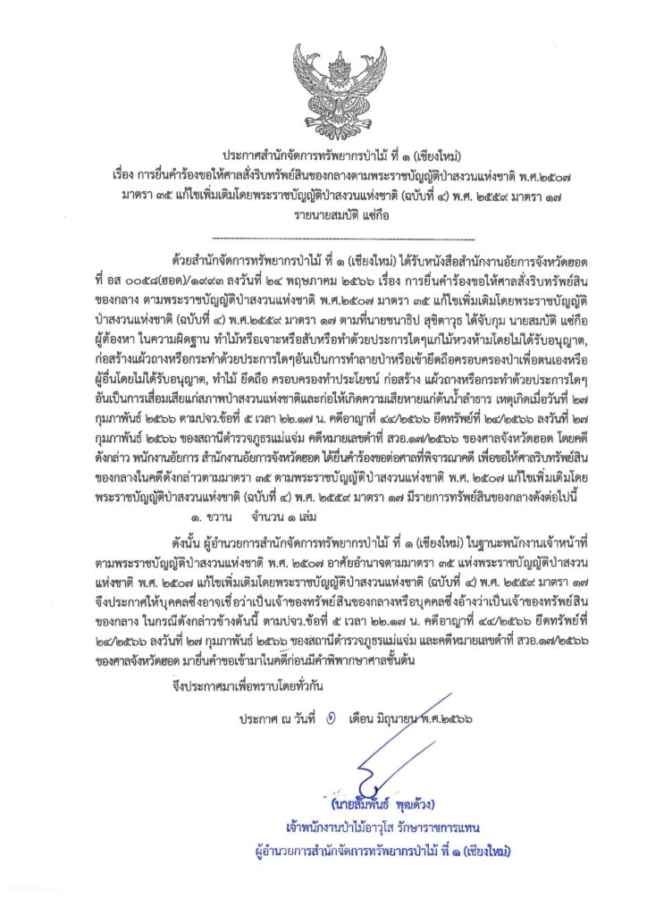 ประกาศสำนักจัดการทรัพยากรป่าไม้ ที่ ๑ (เชียงใหม่) เรื่อง การยื่นคำร้องขอให้ศาลสั่งริบทรัพย์สินของกลางตามพระราชบัญญัติป่าสงวนแห่งชาติ พ.ศ.๒๕๐๗ มาตรา ๓๕ แก้ไขเพิ่มเติมโดยพระราชบัญญัติป่าสงวนแห่งชาติ (ฉบับที่ ๔) พ.ศ. ๒๕๕๙ มาตรา ๑๗ รายนายสมบัติ แซ่ถือ