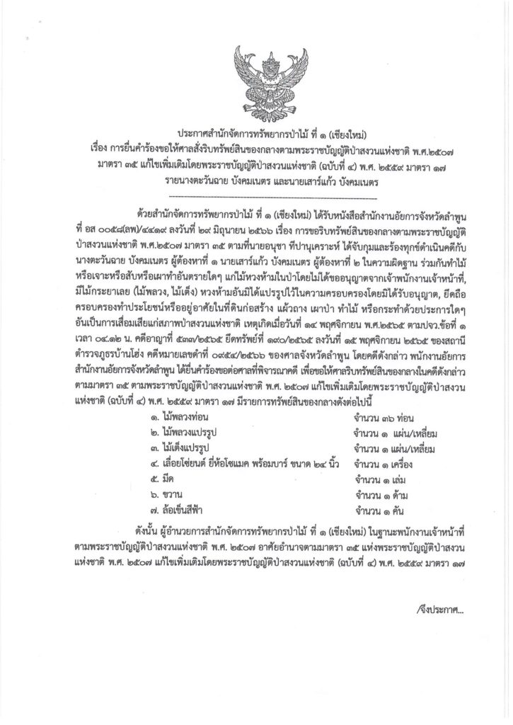 หน้าแรก » ประกาศ » ประกาศสำนักจัดการทรัพยากรป่าไม้ ที่ ๑ (เชียงใหม่) เรื่อง การยื่นคำร้องขอให้ศาลสั่งริบทรัพย์สินของกลางตามพระราชบัญญัติป่าสงวนแห่งชาติ พ.ศ.๒๕๐๗มาตรา ๓๕ แก้ไขเพิ่มเติมโดยพระราชบัญญัติป่าสงวนแห่งชาติ (ฉบับที่ ๔) พ.ศ. ๒๕๕๘ มาตรา ๑๗รายนางตะวันฉาย บังคมเนตร และนายเสาร์แก้ว บังคมเนตร