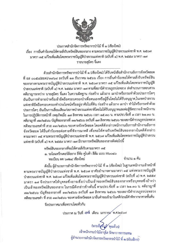 ประกาศสำนักจัดการทรัพยากรป่าไม้ ที่ ๑ (เชียงใหม่) เรื่อง การยื่นคำร้องขอให้ศาลสั่งริบทรัพย์สินของกลาง ตามพระราชบัญญัติป่าสงวนแห่งชาติ พ.ศ. ๒๕๐๗มาตรา ๓๕ แก้ไขเพิ่มเติมโดยพระราชบัญญัติป่าสงวนแห่งชาติ (ฉบับที่ ๔) พ.ศ. ๒๕๕๙ มาตรา ๑๗รายนายสุมิตร จี๋แดง