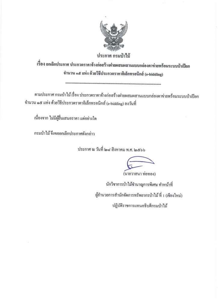 ประกาศ กรมป่าไม้ เรื่อง ยกเลิกประกาศ ประกวดราคาจ้างก่อสร้างฝ่ายผสมผสานแบบกล่องตาข่ายพร้อมระบบป่าเปียกจำนวน ๑๕ แห่ง ด้วยวิธีประกวดราคาอิเล็กทรอนิกส์ (e-bidding)28 สิงหาคม 2023 ใน ประกาศจัดซื้อจัดจ้าง by adminir