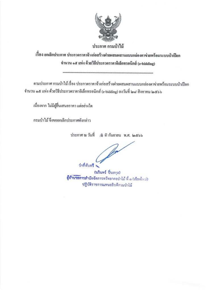 ประกาศ กรมป่าไม้ เรื่อง ยกเลิกประกาศ ประกวดราคาจ้างก่อสร้างฝายผสมผลานแบบกล่องตาข่ายพร้อมระบบป่าเปียกจำนวน ๑๕ แห่ง ด้วยวิธีประกวดราคาอิเล็กทรอนิกส์ (e-bidding)13 กันยายน 2023 ใน ประกาศจัดซื้อจัดจ้าง by adminir