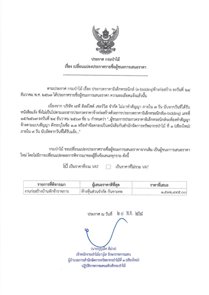 ประกาศ กรมป่าไม้ เรื่อง เปลี่ยนแปลงประกาศรายชื่อผู้ชนะเสนอราคา27 พฤษภาคม 2025 ใน ประกาศจัดซื้อจัดจ้าง / ประกาศผู้ชนะการเสนอราคา by adminir
