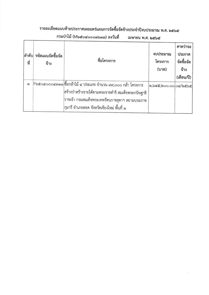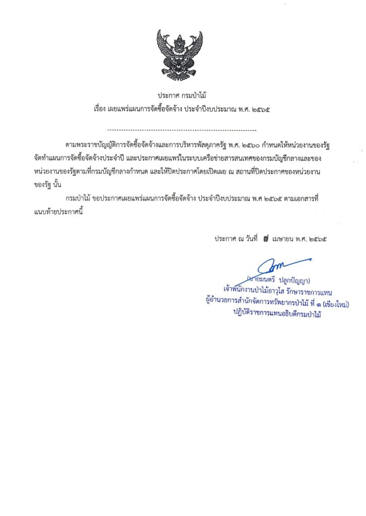 ประกาศ กรมป่าไม้ เรื่อง เผยแพร่แผนการจัดซื้อจัดจ้าง ประจำปีงบประมาณ พ.ศ.2565