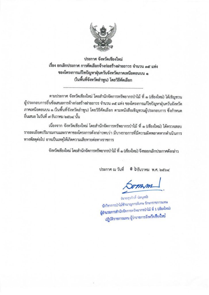 ประกาศ จังหวัดเชียงใหม่ เรื่อง ยกเลิกประกาศ การคัดเลือกจ้างก่อสร้างฝ่ายถาวร จำนวน ๓๕ แห่ง ของโครงการแก้ไขปัญหาฝุ่นควันจังหวัดภาคเหนือตอนบน ๑ (ในพื้นที่จังหวัดลำพูน) โดยวิธีคัดเลือก17 ธันวาคม 2021 ใน ประกาศ by adminir