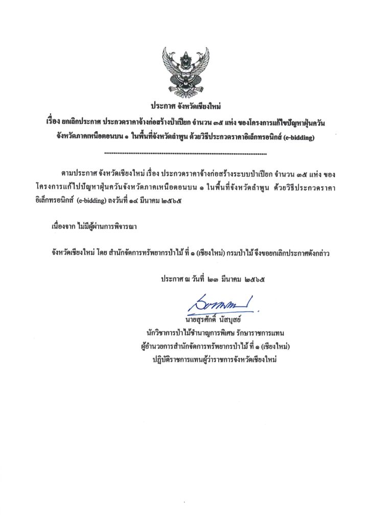 ประกาศ จังหวัดเชียงใหม่ เรื่องยกเลิกประกาศ ประกวดราคาจ้างก่อสร้างป่าเปียก จำนวน ๓๕ แห่ง ของโครงการแก้ไขปัญหาฝุ่นควัน จังหวัดภาคเหนือตอนบน ๑ ในพื้นที่จังหวัดลำพูน ด้วยวิธีประกวดราคาอิเล็กทรอนิกส์ (e-bidding)24 มีนาคม 2022 ใน ประกาศ by adminir