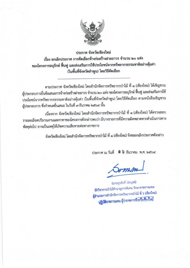 ประกาศ จังหวัดเชียงใหม่ เรื่อง ยกเลิกประกาศ การคัดเลือกจ้างก่อสร้างฝ่ายถาวร จำนวน ๒๐ แห่งของโครงการอนุรักษ์ ฟื้นฟู และส่งเสริมการใช้ประโยชน์จากทรัพยากรธรรมชาติอย่างคุ้มค่า(ในพื้นที่จังหวัดลำพูน) โดยวิธีคัดเลือก17 ธันวาคม 2021 ใน ประกาศ by adminir
