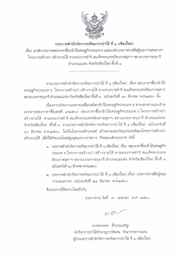 หน้าแรก » ไม่มีหมวดหมู่ » ประกาศ สจป.ที่ 1 (ชม.) เรื่องยกเลิกประกาศสอบราคาซื้อกล้าไม้เศรษฐกิจประเภท ข และยกเลิกประกาศรายชื่อผู้ชนะการเสนอราคาโครงการสร้างป่า สร้างรายได้ ตามพระราชดำริ สมเด็จพระเทพรัตนราชสุดาฯ สยามบรมราชกุมารี อำเภอแม่แจ่ม จังหวัดเชียงใหม่ พื้นที่ 1