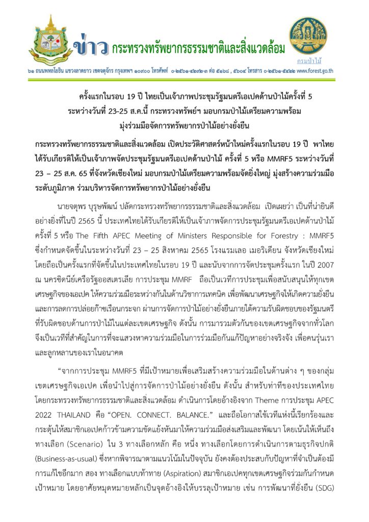 หน้าแรก » ประกาศ » ประชาสัมพันธ์ ข่าว ไทยเป็นเจ้าภาพประชุมรัฐมนตรีเอเปคด้านป่าไม้ครั้งที่ 5 หรือ (The Fifth APEC Meeting of Ministers Responsible for Forestry : MMRF5) ซึ่งกำหนดจัดขึ้นในระหว่างวันที่ 23 – 25 สิงหาคม 2565 โรงแรมเลอ เมอริเดียน จังหวัดเชียงใหม่