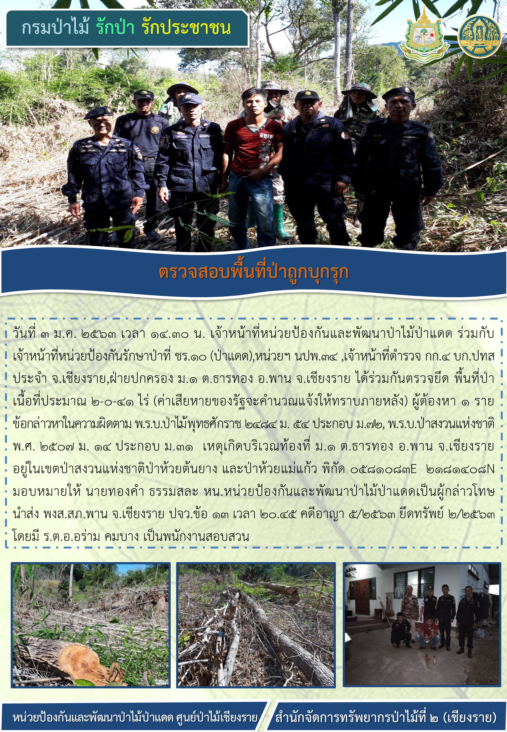 วันที่ 3 ม.ค. 2563 เวลา 14.30 น. เจ้าหน้าที่หน่วยป้องกันและพัฒนาป่าไม้ป่าแดด ร่วมกับ เจ้าหน้าที่หน่วยป้องกันรักษาป่าที่ ชร.10 (ป่าแดด),หน่วยฯ นปพ.34 ,เจ้าหน้าที่ตำรวจ กก.4 บก.ปทส ประจำ จ.เชียงราย,ฝ่ายปกครอง ม.1 ต.ธารทอง อ.พาน จ.เชียงราย ได้ร่วมกันตรวจยึด พื้นที่ป่า เนื้อที่ประมาณ 2-0-41 ไร่ (ค่าเสียหายของรัฐจะคำนวณแจ้งให้ทราบภายหลัง) ผู้ต้องหา 1 ราย ข้อกล่าวหาในความผิดตาม พ.ร.บ.ป่าไม้พุทธศักราช 2484 ม. 54 ประกอบ ม.72, พ.ร.บ.ป่าสงวนแห่งชาติ พ.ศ. 2507 ม. 14 ประกอบ ม.31 เหตุเกิดบริเวณท้องที่ ม.1 ต.ธารทอง อ.พาน จ.เชียงราย อยู่ในเขตป่าสงวนแห่งชาติป่าห้วยต้นยาง และป่าห้วยแม่แก้ว พิกัด 0581083E 2181408N มอบหมายให้ นายทองคำ ธรรมสละ หน.หน่วยป้องกันและพัฒนาป่าไม้ป่าแดดเป็นผู้กล่าวโทษ นำส่ง พงส.สภ.พาน จ.เชียงราย ปจว.ข้อ 13 เวลา 20.45 คดีอาญา 5/2563 ยึดทรัพย์ 2/2563 โดยมี ร.ต.อ.อร่าม คมบาง เป็นพนักงานสอบสวน