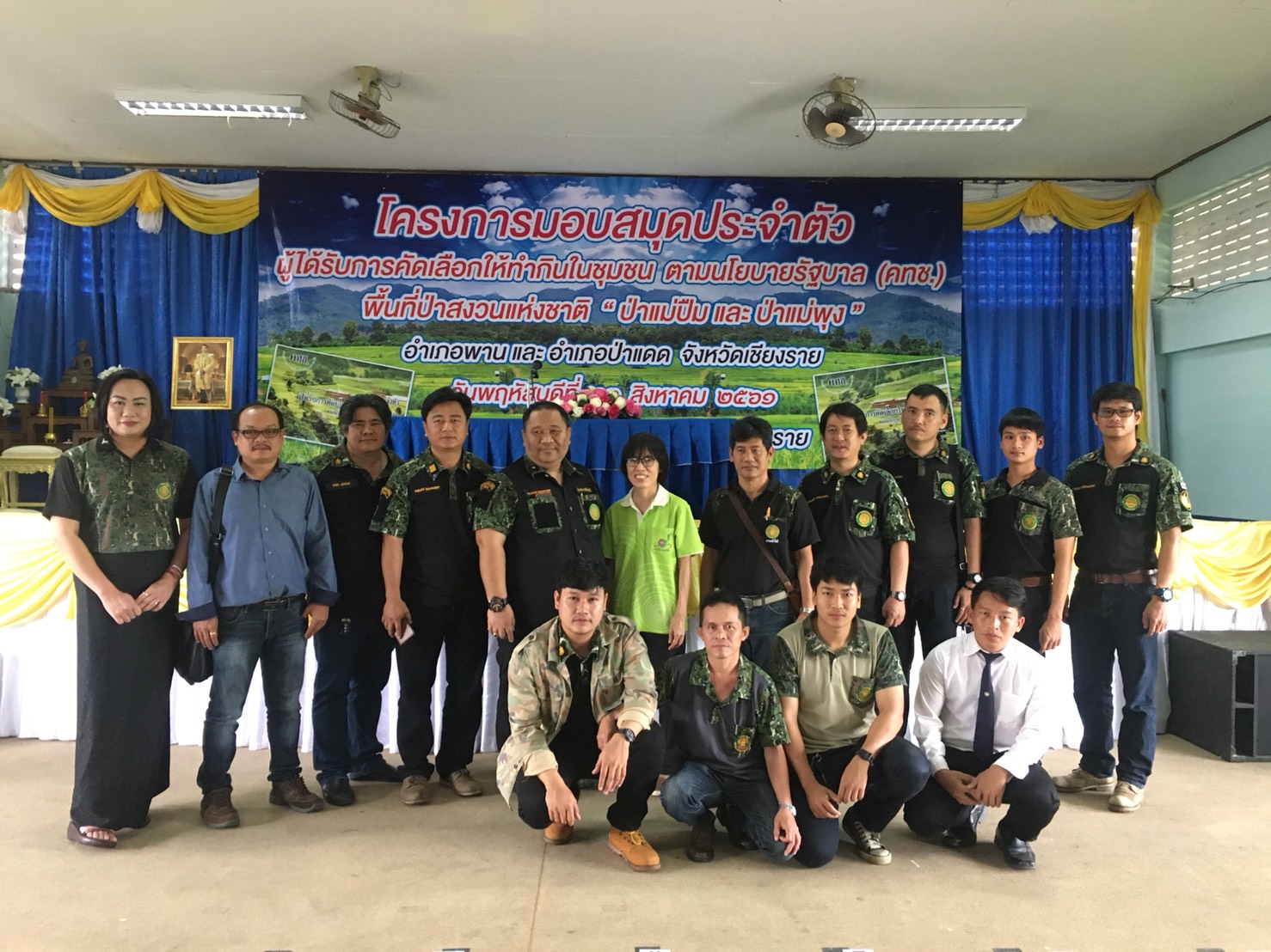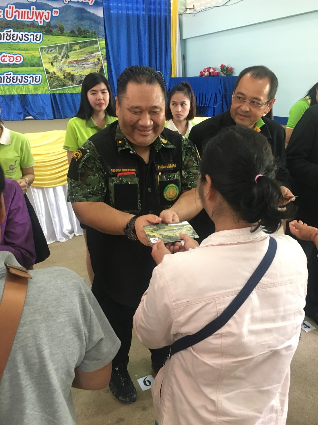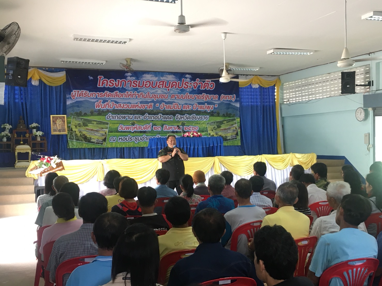 นายเจษฏา เงินทอง ผู้อำนวยการส่วนจัดการที่ดินป่าไม้ และเจ้าหน้าที่ส่วนจัดการที่ดินป่าไม้ ร่วมโครงการมอบสมุดประจำตัวผู้ได้รับการคัดเลือกให้ทำกินในชุมชนตามนโยบายรัฐบาล (คทช.) พื้นที่ป่าสงวนแห่งชาติป่าแม่ปืมและป่าแม่พุง ท้องที่อำเภอพานและอำเภอป่าแดดจังหวัดเชียงราย ณ หอประชุมที่ว่าการอำเภอป่าแดด