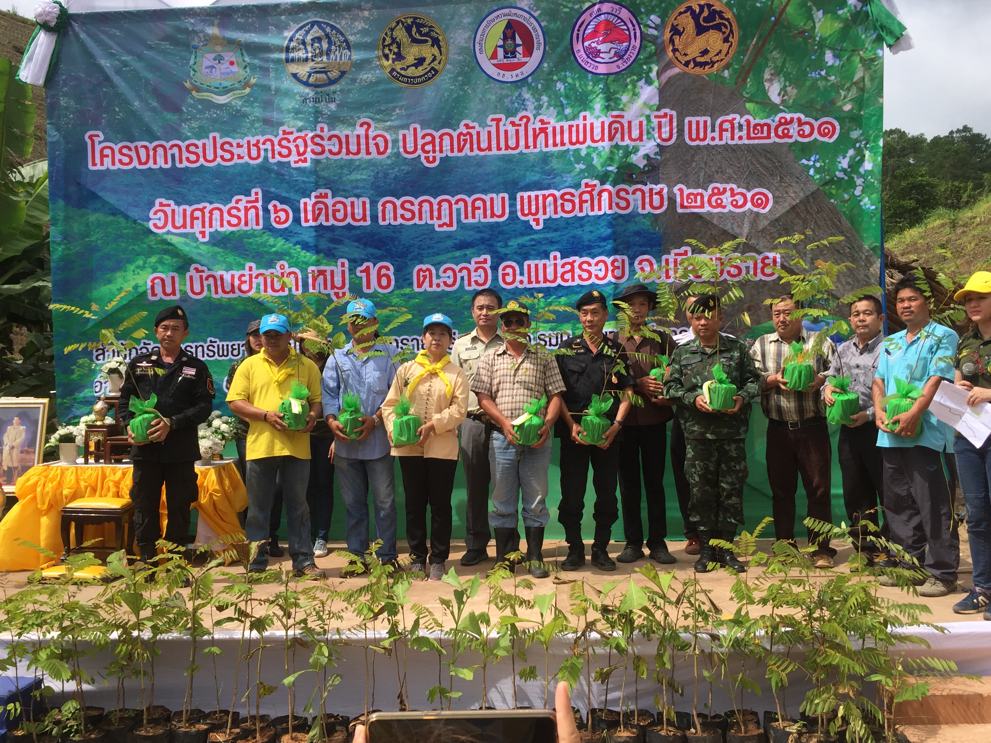 นายนิกร ศิรโรจนานนท์ ผู้อำนวยการส่วนส่งเสริมการปลูกป่า สำนักจัดการทรัพยากรป่าไม้ที่ 2 (เชียงราย) ร่วมกับ กอ.รมน. จังหวัดเชียงราย, อำเภอแม่สรวย, องค์การบริหารส่วนตำบลวาวี, ชมรมกำนันผู้ใหญ่บ้านตำบลวาวี, และน้องๆเยาวชนนักเรียน โรงเรียนโป่งกลางน้ำประชาสรรค์ ตำบลวาวี อำเภอแม่สรวย จังหวัดเชียงราย ร่วมปลูกป่า โครงการประชารัฐร่วมใจ ปลูกต้นไม้ให้แผ่นดิน ปี พ.ศ. 2561 ณ บ้านย่านำ หมู่ 16 ตำบลวาวี อำเภอแม่สรวย จังหวัดเชียงราย