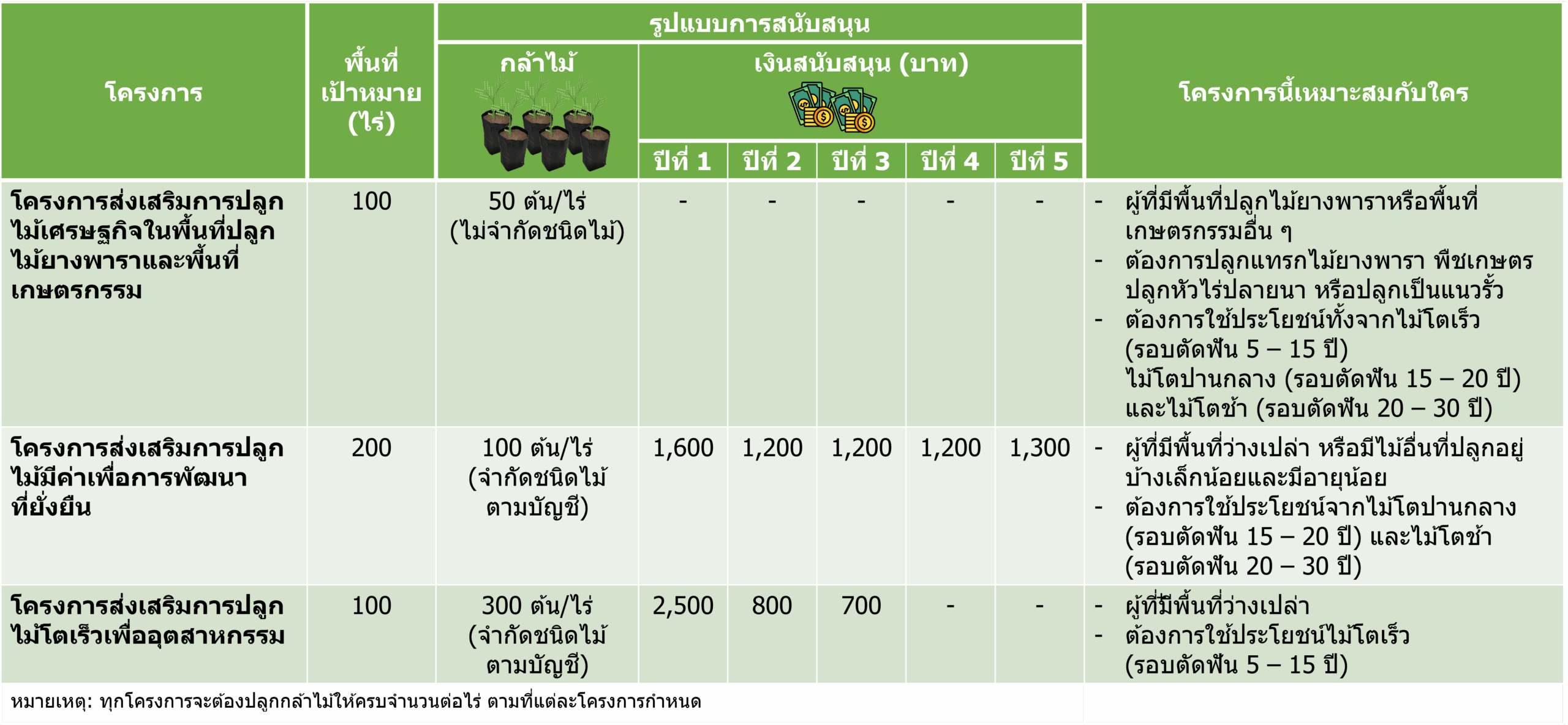 กรมป่าไม้ มีความมุ่งหวังให้เกษตรกรหันมาให้ความสนใจในการปลูกไม้เศรษฐกิจ เพื่อให้เกิดการใช้ประโยชน์ที่ดินอย่างคุ้มค่า มีไม้ไว้ใช้สอย และมีรายได้จากการจำหน่ายไม้ รวมถึงเพื่อเพิ่มผลผลิตไม้รองรับอุตสาหกรรมที่ใช้ไม้เป็นวัตถุดิบ กรมป่าไม้ จึงได้กำหนดโครงการส่งเสริมการปลูกไม้เศรษฐกิจและรูปแบบการสนับสนุนที่แตกต่างกัน เพื่อให้เกษตรกรสามารถเลือกเข้าร่วมได้ตามความเหมาะสม จำนวน 3 โครงการ ดังนี้