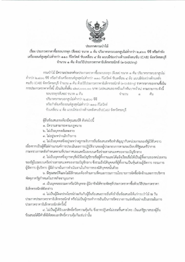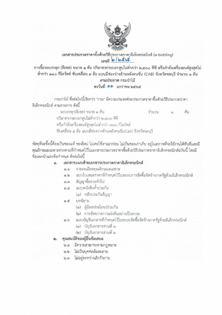 เรื่อง ประกวดราคาซื้อรถบรรทุก (ดีเซล) ขนาด 1 ตัน ปริมาตรกระบอกสูบไม่ต่ำกว่า 2,400 ซีซี หรือกำลังเครื่องยนต์สูงสุดไม่ต่ำกว่า 110 กิโลวัตต์ ขับเคลื่อน 4 ล้อ แบบมีช่องว่างด้านหลังคนขับ (CAB) จำนวน 1 คัน ประกาศ ณ วันที่ 11 มกราคม พ.ศ. 2565 (ศูนย์ส่งเสริมวนศาสตร์ชุมชนที่ 6 ระยอง)