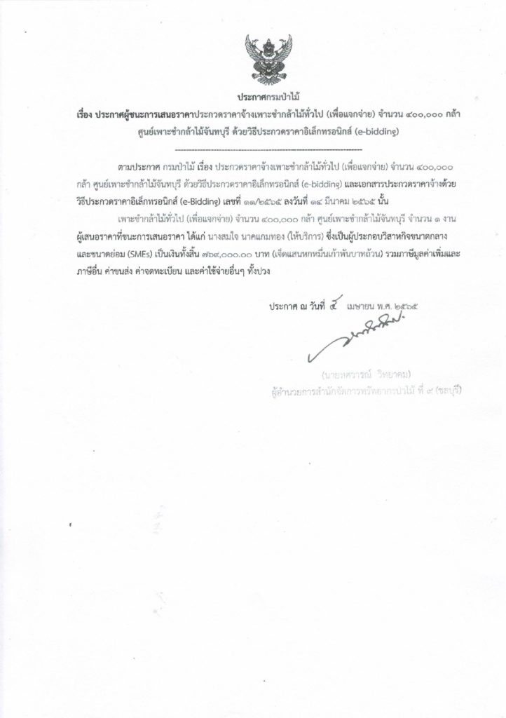 ประกาศผู้ชนะการเสนอราคาประกวดราคาจ้างเพาะชำกล้าไม้ทั่วไป (เพื่อแจกจ่าย) จำนวน 400,000 กล้า ศูนย์เพาะชำกล้าไม้จันทบุรี วันที่ 5 เมษายน 2565 ประกาศกรมป่าไม้ เรื่อง ประกาศผู้ชนะการเสนอราคาประกวดราคาจ้างเพาะชำกล้าไม้ทั่วไป (เพื่อแจกจ่าย) จำนวน 400,000 กล้า ศูนย์เพาะชำกล้าไม้จันทบุรี ด้วยวิธีประกวดราคาอิเล็กทรอนิกส์ (e-bidding) เป็นเงินทั้งสิ้น 769,000 บาท ประกาศ ณ วันที่ 5 เมษายน พ.ศ. 2565