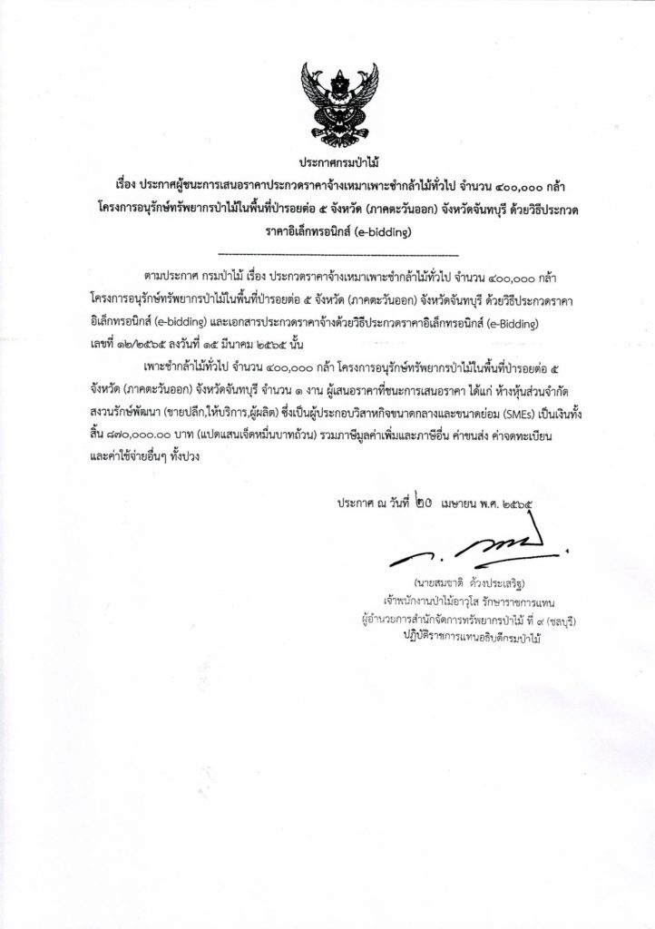ประกาศผู้ชนะการเสนอราคาประกวดราคาจ้างเหมาเพาะชำกล้าไม้ทั่วไป จำนวน 400,000 กล้า โครงการอนุรักษ์ทรัพยากรป่าไม้ในพื้นที่ป่ารอยต่อ 5 จังหวัด (ภาคตะวันออก) จังหวัดจันทบุรี วันที่ 20 เมษายน 2565 ประกาศกรมป่าไม้ เรื่อง ประกาศผู้ชนะการเสนอราคาประกวดราคาจ้างเหมาเพาะชำกล้าไม้ทั่วไป จำนวน 400,000 กล้า โครงการอนุรักษ์ทรัพยากรป่าไม้ในพื้นที่ป่ารอยต่อ 5 จังหวัด (ภาคตะวันออก) จังหวัดจันทบุรี ด้วยวิธีประกวดราคาอิเล็กทรอนิกส์ (e-bidding) เป็นเงินทั้งสิ้น 870,000 บาท ประกาศ ณ วันที่ 20 เมษายน พ.ศ. 2565