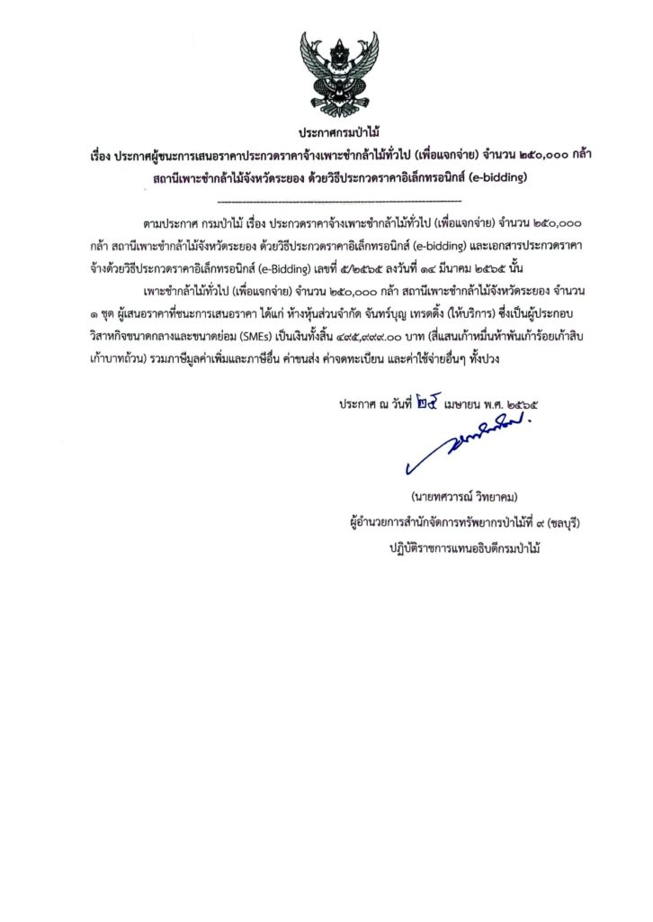 เรื่อง ประกาศผู้ชนะการเสนอราคาประกวดราคาจ้างเพาะชำกล้าไม้ทั่วไป (เพื่อแจกจ่าย) จำนวน 250,000 กล้า สถานีเพาะชำกล้าไม้จังหวัดระยอง วันที่ 25 เมษายน 2565 ประกาศกรมป่าไม้ เรื่อง ประกาศผู้ชนะการเสนอราคาประกวดราคาจ้างเพาะชำกล้าไม้ทั่วไป (เพื่อแจกจ่าย) จำนวน 250,000 กล้า สถานีเพาะชำกล้าไม้จังหวัดระยอง ด้วยวิธีประกวดราคาอิเล็กทรอนิกส์ (e-bidding) เป็นเงินทั้งสิ้น 495,999 บาท ประกาศ ณ วันที่ 25 เมษายน พ.ศ. 2565