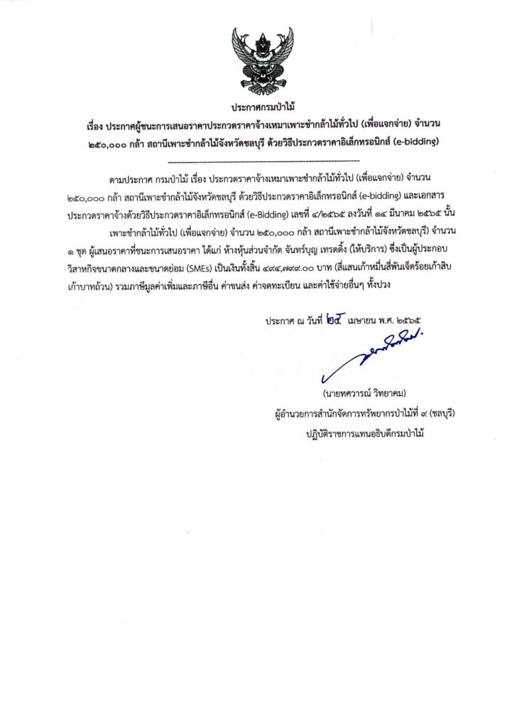 เรื่อง ประกาศผู้ชนะการเสนอราคมประกวดราคาจ้างเหมาเพาะชำกล้าไม้ทั่วไป (เพื่อแจกจ่าย) จำนวน 250,000 กล้า สถานีเพาะชำกล้าไม้จังหวัดชลบุรี วันที่ 25 เมษายน 2565 ประกาศกรมป่าไม้ เรื่อง ประกาศผู้ชนะการเสนอราคมประกวดราคาจ้างเหมาเพาะชำกล้าไม้ทั่วไป (เพื่อแจกจ่าย) จำนวน 250,000 กล้า สถานีเพาะชำกล้าไม้จังหวัดชลบุรี ด้วยวิธีประกวดราคาอิเล็กทรอนิกส์ (e-bidding) เป็นเงินทั้งสิ้น 494,799 บาท ประกาศ ณ วันที่ 25 เมษายน พ.ศ. 2565