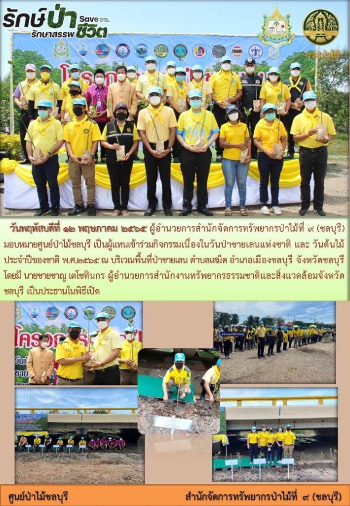 วันที่ 12 พฤษภาคม 2565 ผู้อำนวยการสำนักจัดการทรัพยากรป่าไม้ที่ 9 (ชลบุรี) มอบหมายให้ศูนย์ป่าไม้ชลบุรี เป็นผู้แทนเข้าร่วมกิจกรรมเนื่องในวันป่าชายเลนแห่งชาติ และวันต้นไม้ประจำของชาติ พ.ศ. 2565 ณ บริเวณพื้นที่ป่าชายเลน ตำบลเสม็ด อำเภอเมืองชลบุรี จังหวัดชลบุรี โดยมีนายชายชาญ เตโชทินกร ผู้อำนวยการสำนักงานทรัพยากรธรรมชาติและสิ่งแวดล้อมจังหวัดชลบุรี เป็นประทานในพิธี