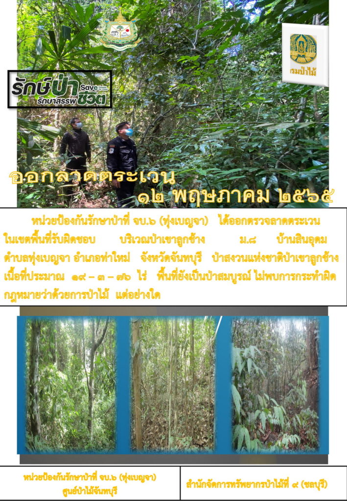 วันที่ 12 พฤษภาคม 2565 หน่วยป้องกันรักษาป่าที่ จบ.6 (ทุ่งเบญจา) ได้ออกตรวจลาดตระเวนในเขตพื้นที่รับผิดชอบ บริเวณป่าเขาลูกช้าง หมู่ที่ 8 บ้านสินอุดม ตำบลทุ่งเบญจา อำเภอท่าใหม่ จังหวัดจันทบุรี ป่าสงวนแห่งชาติป่าเขาลูกช้าง เนื้อที่ประมาณ 19-3-76 ไร่ พื้นที่ยังเป็นป่าสมบูรณ์ ไม่พบการกระทำผิดกฎหมายว่าด้วยการป่าไม้แต่อย่างใด