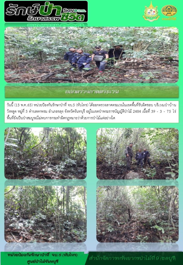 วันที่ 13 พฤษภาคม 2565 หน่วยป้องกันรักษาป่าที่ จบ.5 (ทับไทร) ได้ออกตรวจลาดตระเวนในเขตพื้นที่รับผิดชอบ บริเวณป่าบ้านวังหลูต หมู่ที่ 5 ตำบลตกพรม อำเภอขลุง จังหวัดจันทบุรี อยู่ในเขตป่าพระราชบัญญัติป่าไม้ 2484 เนื้อที่ 39-3-75 ไร่ พื้นที่ยังเป็นป่าสมบูรณ์ ไม่พบการกระทำผิดกฎหมายว่าด้วยการป่าไม้แต่อย่างใด