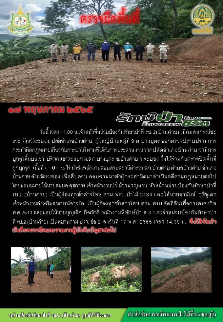 วันที่ 17 พฤษภาคม 2565 เวลา 11.00 น. เจ้าหน้าที่หน่วยป้องกันรักษาป่าที่ รย.2 (บ้านค่าย) นิคมสหกรณ์ชะแวพ จังหวัดระยอง ปลัดอำเภอบ้านค่าย ผู้ใหญ่บ้านหมู่ที่ 9 ตำบลบางบุตร ออกตรวจปราบปรามการบุกรุกพื้นที่บนเขา บริเวณเขาตะแบก หมู่ที่ 9 ตำบลบางบุตร อำเภอบ้านค่าย จังหวัดระยอง จึงได้ร่วมกันตรวจยึดพื้นที่ที่ถูกบุกรุก เนื้อที่ 4-0-15 ไร่ นำส่งพนักงานสอบสวนสถานีตำรวจ สภ.บ้านค่ายตำบลบ้านค่าย อำเภอบ้านค่าย จังหวัดระยอง เพื่อสืบสวนสอบสวนหาตัวผู้กระทำผิดมาดำเนินคดีตามกฎหมายต่อไป โดยมอบหมายให้นายสมยศ สุขถาวร เจ้าพนักงานป่าไม้ชำนาญงาน หัวหน้าหน่วยป้องกันรักษาป่าที่ รย.2 (บ้านค่าย) เป็นผู้ร้องทุกข์กล่าวโทษ ตาม พรบ.ป่าไม้ 2484 และให้นายอานันท์ ชุติชูเดช เจ้าพนักงานส่งเสริมสหกรณ์อาวุโส เป็นผู้ร้องทุกข์กล่าวโทษ ตาม พรบ. จัดที่ดินเพื่อการครองชีพ พ.ศ. 2511 และมอบให้นายบุญเลิศ กิจภักดี พนักงานพิทักษ์ป่า ส.3 ประจำหน่วยป้องกันรักษาป่าที่ รย.2 (บ้านค่าย) เป็นพยานตาม ปจว.ข้อ 2 ลงวันที่ 17 พฤษภาคม 2565 เวลา 14.30 น.