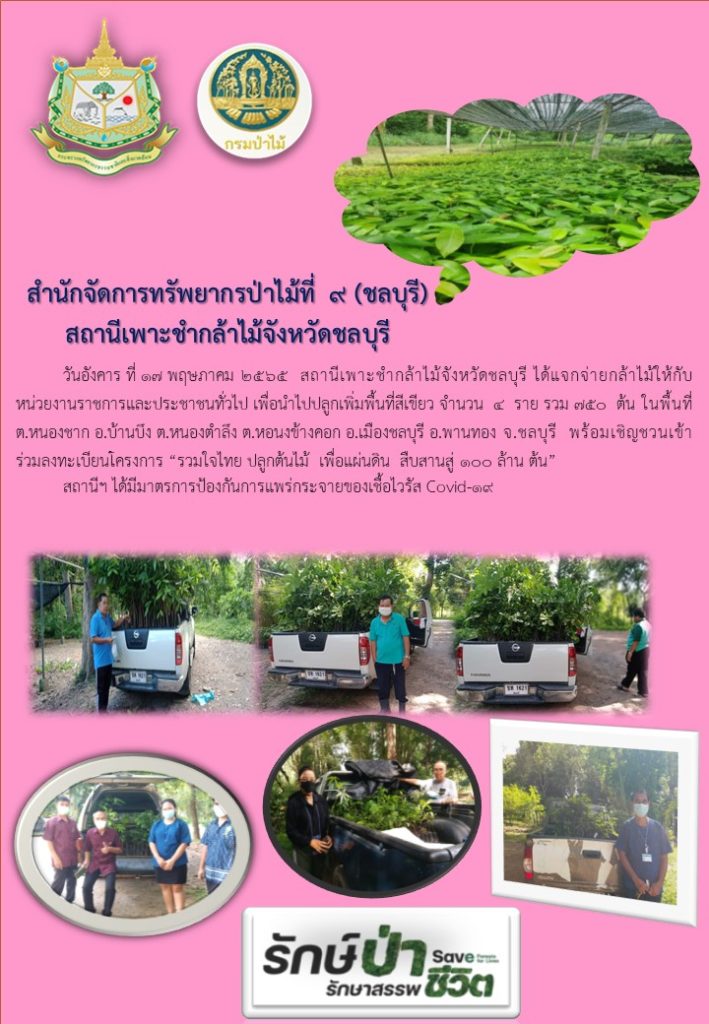 วันที่ 17 พฤษภาคม 2565 สถานีเพาะชำกล้าไม้จังหวัดชลบุรี ได้แจกจ่ายกล้าไม้ให้กับหน่วยงานราชการและประชาชนทั่วไป เพื่อนำไปปลูกเพิ่มพื้นที่สีเขียว 4 ราย จำนวน 750 ต้น ในพื้นที่ตำบลหนองชาก อำเภอบ้านบึง ตำบลหนองตำลึง ตำบลหนองข้างคอก จังหวัดชลบุรี พร้อมเชิญชวนเข้าร่วมลงทะเบียนโครงการ “รวมใจไทย ปลูกต้นไม้ เพื่อแผ่นดิน สืบสานสู่ 100 ล้านต้น”