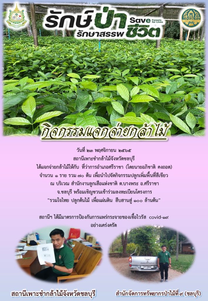 สถานีเพาะชำกล้าไม้จังหวัดชลบุรี ได้แจกจ่ายกล้าไม้ให้กับที่ว่าการอำเภอศรีราชา จำนวน 70 ต้น เพื่อนำไปจัดกิจกรรมปลูกเพิ่มพื้นที่สีเขียว ณ บริเวณสำนักงานลูกเสือแห่งชาติ ตำบลบางพระ อำเภอศรีราชา จังหวัดชลบุรี พร้อมเชิญชวนเข้าร่วมลงทะเบียนโครงการ “รวมใจไทย ปลูกต้นไม้ เพื่อแผ่นดิน สืบสานสู่ 100 ล้านต้น”