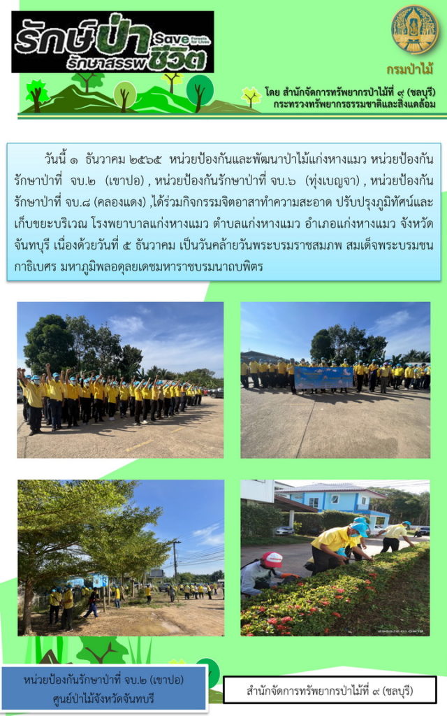 หน่วยป้องกันและพัฒนาป่าไม้แก่งหางแมว หน่วยป้องกันรักษาป่าที่ จบ.2 (เขาปอ) หน่วยป้องกันรักษาป่าที่ จบ.6 (ทุ่งเบญจา) หน่วยป้องกันรักษาป่าที่ จบ.8 (คลองแดง) ได้ร่วมกิจกรรมจิตอาสาทำความสะอาด ปรับปรุงภูมิทัศน์ และเก็บขยะบริเวณ โรงพยาบาลแก่งหางแมว ตำบลแก่งหางแมว อำเภอแก่งหางแมว จังหวัดจันทบุรี เนื่องด้วยวันที่ 5 ธันวาคม เป็นวันคล้ายวันพระบรมราชสมภพ สมเด็จพระบรมชนกาธิเบศร มหาภูมิพลอดุลยเดชมหาราช บรมนาถบพิตร