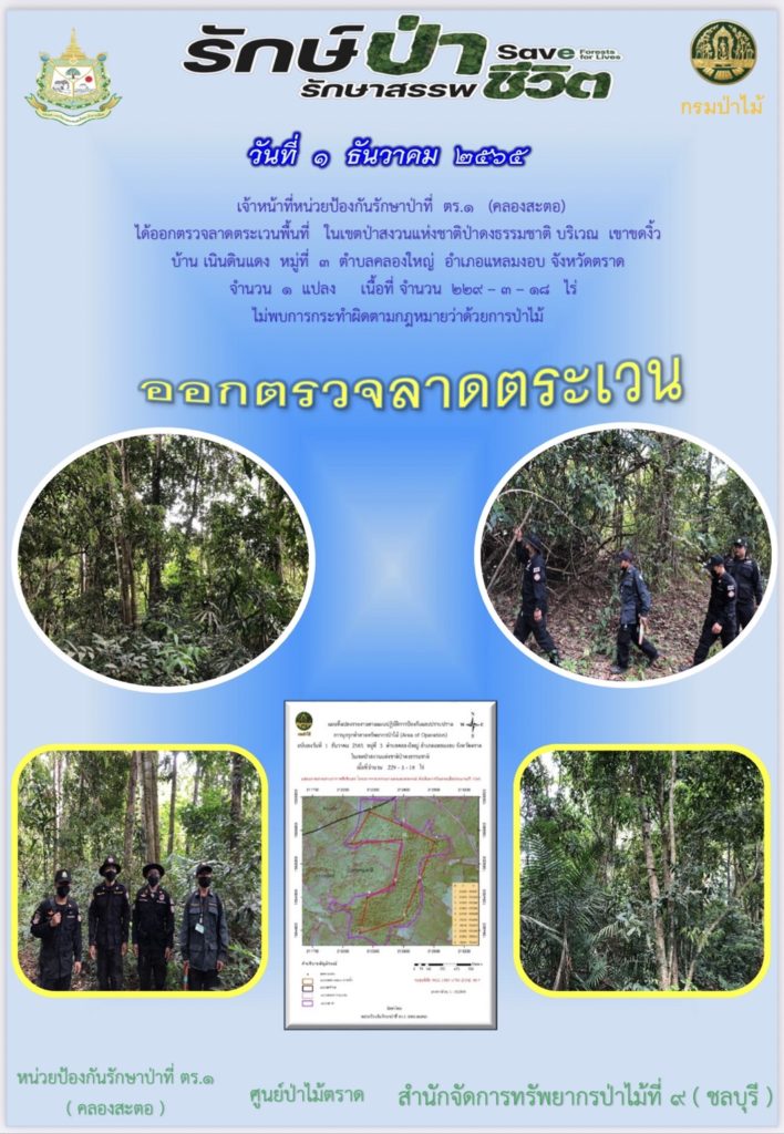 เจ้าหน้าที่หน่วยป้องกันรักษาป่าที่ ตร.1 (คลองสะตอ) ได้ออกตรวจลาดตระเวนพื้นที่ ในเขตป่าสงวนแห่งชาติป่าดงธรรมชาติ บริเวณเขาขดงิ้ว บ้านเนินดินแดง หมู่ที่ 3 ตำบลคลองใหญ่ อำเภอแหลมงอบ จังหวัดตราด จำนวน 1 แปลง เนื้อที่ 229-3-18 ไร่ ไม่พบการกระทำผิดกฎหมายว่าด้วยการป่าไม้