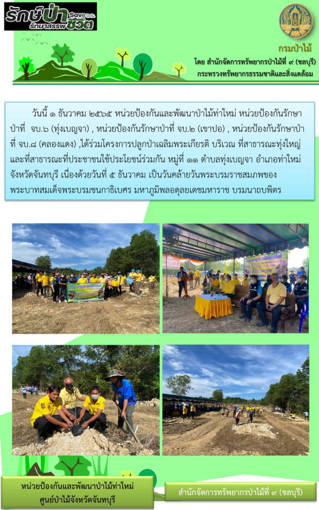 หน่วยป้องกันและพัฒนาป่าไม้ท่าใหม่ หน่วยป้องกันรักษาป่าที่ จบ.6 (ทุ่งเบญจา) หน่วยป้องกันรักษาป่าที่ จบ.2 (เขาปอ) หน่วยป้องกันรักษาป่าที่ จบ.8 (คลองแดง) ได้ร่วมโครงการปลูกป่าเฉลิมพระเกียรติ บริเวณที่สาธารณะทุ่งใหญ่ และที่สาธารณะที่ประชาชนใช้ประโยชน์ร่วมกัน หมู่ที่ 11 ตำบลทุ่งเบญจา อำเภอท่าใหม่ จังหวัดจันทบุรี เนื่องด้วยวันที่ 5 ธันวาคม เป็นวันคล้ายวันพระบรมราชสมภพ พระบาทสมเด็จพระบรมชนกาธิเบศร มหาภูมิพลอดุลยเดชมหาราช บรมนาถบพิตร
