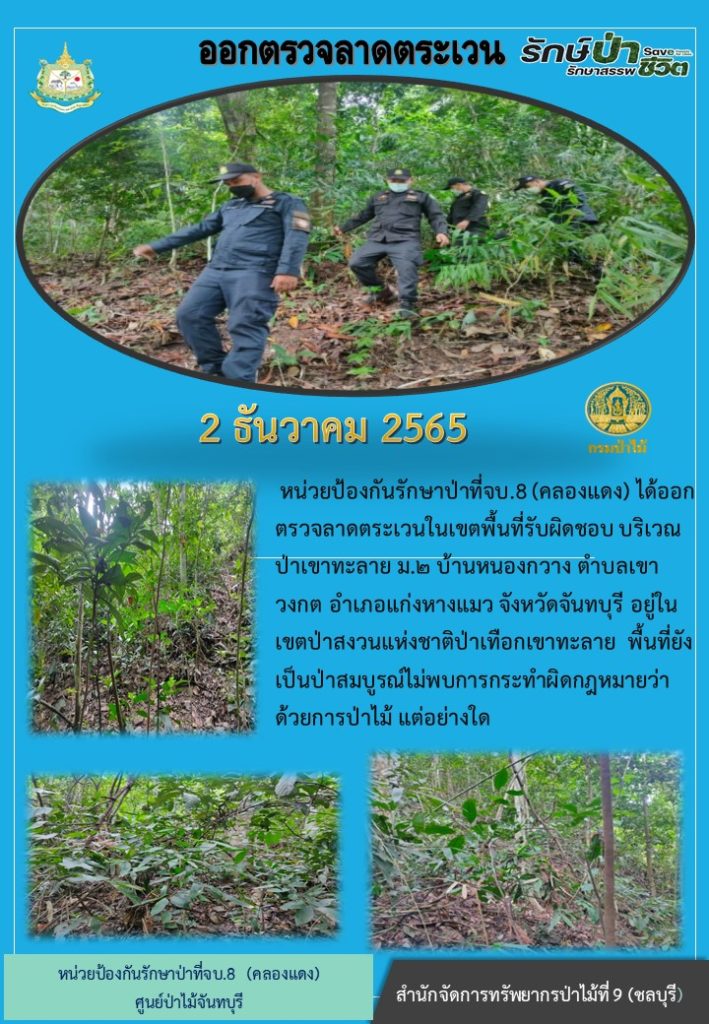 หน่วยป้องกันรักษาป่าที่ จบ.8 (คลองแดง) ได้ออกตรวจลาดตระเวนในเขตพื้นที่รับผิดชอบ บริเวณป่าเขาทะลาย หมู่ที่ 2 บ้านหนองกวาง ตำบลเขาวงกต อำเภอแก่งหางแมว จังหวัดจันทบุรี อยู่ในเขตป่าสงวนแห่งชาติป่าเทือกเขาทะลาย พื้นที่ยังเป็นป่าสมบูรณ์ ไม่พบการกระทำผิดกฎหมายว่าด้วยการป่าไม้แต่อย่างใด