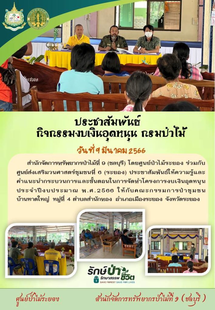 สำนักจัดการทรัพยากรป่าไม้ที่ 9 (ชลบุรี) โดยศูนย์ป่าไม้ระยอง ร่วมกับศูนย์ส่งเสริมวนศาสตร์ชุมชนที่ 6 (ระยอง) ประชาสัมพันธ์ให้ความรู้และคำแนะนำกระบวนการและขั้นตอนในการจัดทำโครงการงบเงินอุดหนุน ประจำปีงบประมาณ พ.ศ. 2566 ให้กับคณะกรรมการป่าชุมชนบ้านหาดใหญ่ หมู่ที่ 4 ตำบลสำนักทอง อำเภอเมืองระยอง จังหวัดระยอง