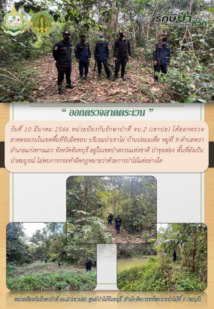 หน่วยป้องกันรักษาป่าที่ จบ.2 (เขาปอ) ได้ออกตรวจลาดตระเวนในเขตพื้นที่รับผิดชอบ บริเวณป่าเขาไผ่ บ้านบ่อมะเดื่อ หมู่ที่ 9 ตำบลพวา อำเภอแก่งหางแมว จังหวัดจันทบุรี อยู่ในเขตป่าสงวนแห่งชาติ ป่าขุนซ่อง พื้นที่ยังเป็นป่าสมบูรณ์ ไม่พบการกระทำผิดกฎหมายว่าด้วยการป่าไม้แต่อย่างใด