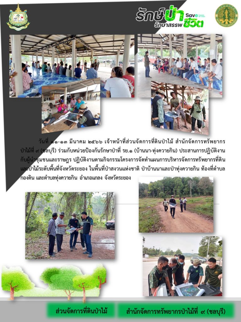 เจ้าหน้าที่ส่วนจัดการที่ดินป่าไม้ สำนักจัดการทรัพยากรป่าไม้ที่ 9 (ชลบุรี) ร่วมกับหน่วยป้องกันรักษาป่าที่ รย.1 (บ้านนา-ทุ่งควายกิน) ประสานการปฏิบัติงานกับผู้นำชุมชนและราษฎร ปฏิบัติงานตามกิจกรรมโครงการจัดทำแผนการบริหารจัดการทรัพยากรที่ดินและป่าไม้ระดับพื้นที่จังหวัดระยอง ในพื้นที่ป่าสงวนแห่งชาติ ป่าบ้านนาและป่าทุ่งควายกิน ท้องที่ตำบลกองดิน และตำบลทุ่งควายกิน อำเภอแกลง จังหวัดระยอง