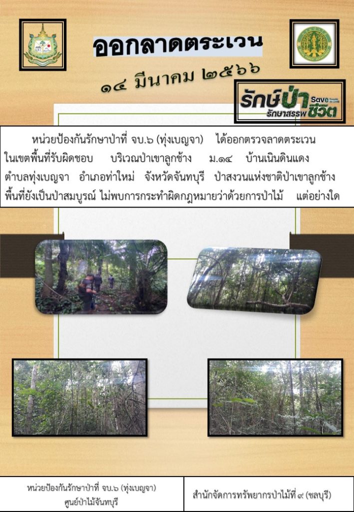 หน่วยป้องกันรักษาป่าที่ จบ.6 (ทุ่งเบญจา) ได้ออกตรวจลาดตระเวนในเขตพื้นที่รับผิดชอบ บริเวณป่าเขาลูกช้าง หมู่ที่ 14 บ้านเนินดินแดง ตำบลทุ่งเบญจา อำเภอท่าใหม่ จังหวัดจันทบุรี ป่าสงวนแห่งชาติป่าเขาลูกช้าง พื้นที่ยังเป็นป่าสมบูรณ์ ไม่พบการกระทำผิดกฎหมายว่าด้วยการป่าไม้แต่อย่างใด