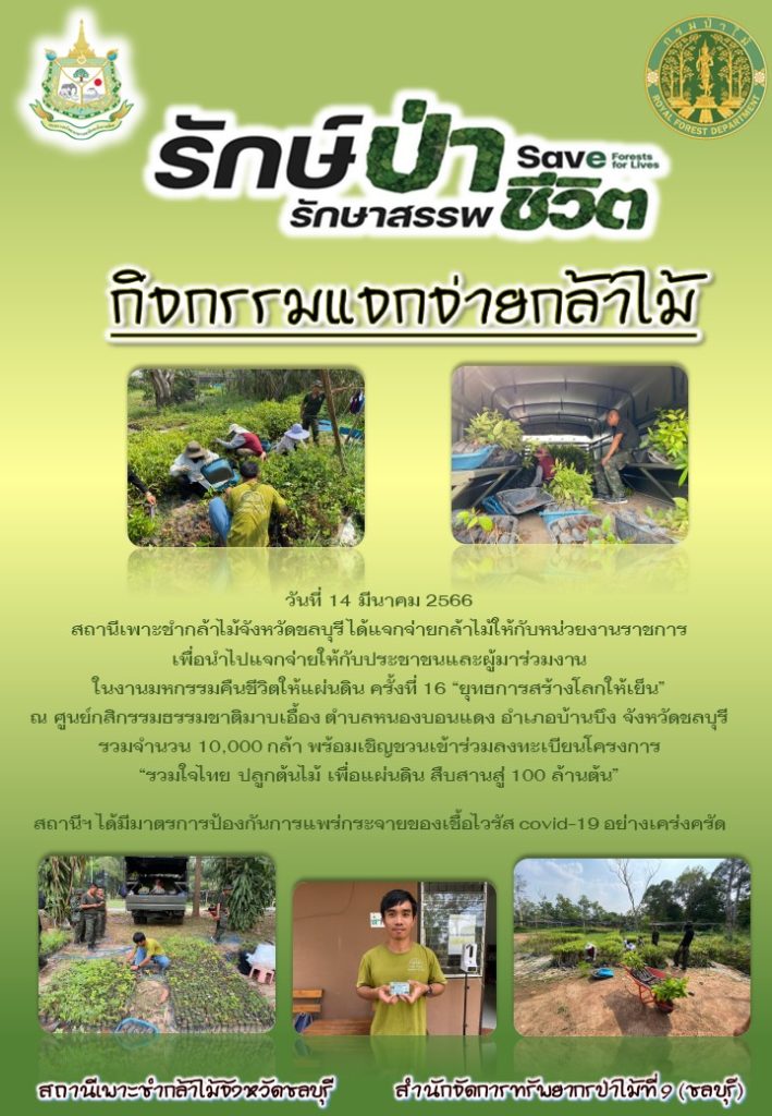 สถานีเพาะชำกล้าไม้จังหวัดชลบุรี ได้แจกจ่ายกล้าไม้ให้กับหน่วยงานราชการ เพื่อนำไปแจกจ่ายให้กับประชาชนและผู้มาร่วมงาน ในงานมหกรรมคืนชีวิตใหม่แผ่นดิน ครั้งที่ 16 “ยุทธการสร้างโลกให้เย็น” ณ ศูนย์กสิกรรมธรรมชาติมาาบเอื้อง ตำบลหนองบอนแดง อำเภอบ้านบึง จังหวัดชลบุรี รวมจำนวน 10,000 กล้า พร้อมเชิญชวนเข้าร่วมลงทะเบียนโครงการ “รวมใจไทย ปลูกต้นไม้ เพื่อแผ่นดิน สืบสานสู่ 100 ล้านต้น”