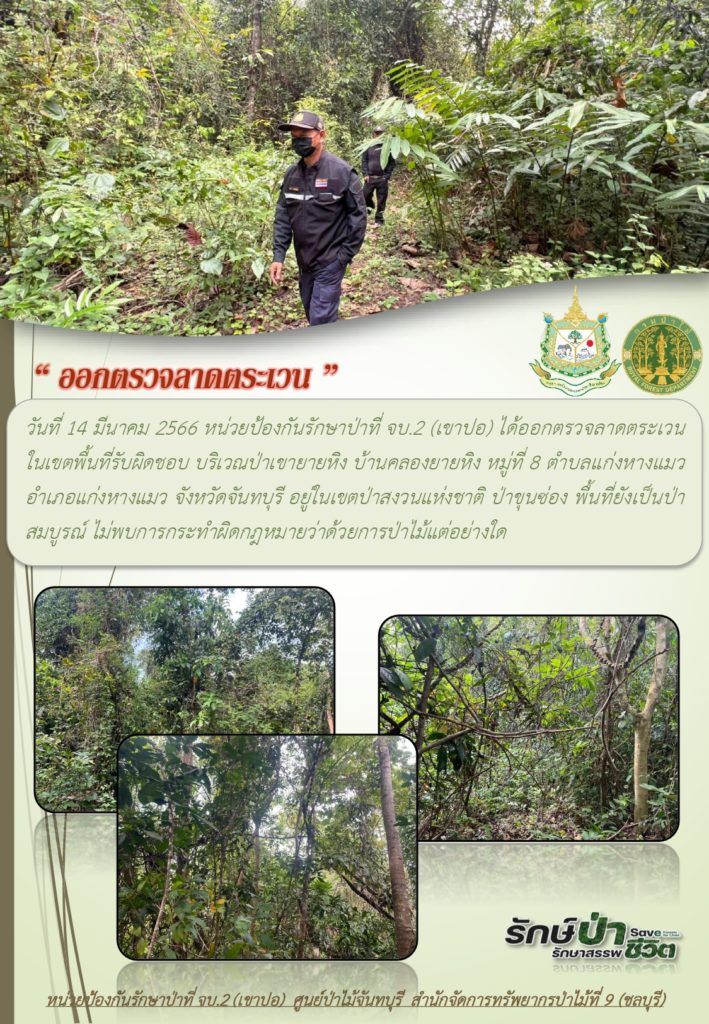 หน่วยป้องกันรักษาป่าที่ จบ.2 (เขาปอ) ได้ออกตรวจลาดตระเวนในเขตพื้นที่รับผิดชอบ บริเวณป่าเขายายหิง บ้านคลองยายหิง หมู่ที่ 8 ตำบลแก่งหางแมว อำเภอแก่งหางแมว จังหวัดจันทบุรี อยู่ในเขตป่าสงวนแห่งชาติป่าขุนซ่อง พื้นที่ยังเป็นป่าสมบูรณ์ ไม่พบการกระทำผิดกฎหมายว่าด้วยการป่าไม้แต่อย่างใด
