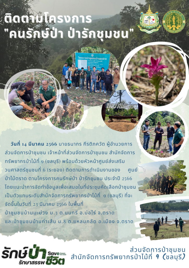 นายธนากร กีรติภควัต ผู้อำนวยการส่วนจัดการป่าชุมชน เจ้าหน้าที่ส่วนจัดการป่าชุมชน สำนักจัดการทรัพยากรป่าไม้ที่ 9 (ชลบุรี) พร้อมด้วยหัวหน้าศูนย์างเสริมวนศาสตร์ชุมชนที่ 6 (ระยอง) ติดตามการดำเนินงานของ ศูนย์ป่าไม้ตราด ตามโครงการคนรักษ์ป่า ป่ารักชุมชน ประจำปี 2566 โดยแนะนำการจัดทำข้อมูลเพื่อเสนอในที่ประชุมคัดเลือกป่าชุมชน เป็นตัวแทนระดับสำนักจัดการทรัพยากรป่าไม้ที่ 9 (ชลบุรี) ที่จะจัดขึ้นในวันที่ 23 มีนาคม 2566 ในพื้นที่ป่าชุมชนบ้านมะม่วง หมู่ที่ 3 ตำบลนนทรีย์ อำเภอบ่อไร่ จังหวัดตราด และป่าชุมชนบ้านท่าเส้น หมู่ที่ 8 ตำบลแหลมกลัด อำเภอเมือง จังหวัดตราด
