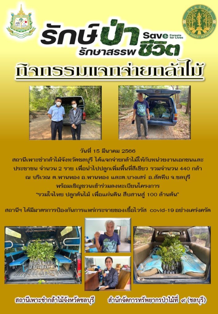 สถานีเพาะชำกล้าไม้จังหวัดชลบุรี ได้แจกจ่ายกล้าไม้ให้กับหน่วยงานเอกชนและประชาชน 2 ราย เพื่อนำไปปลูกเพิ่มพื้นที่สีเขียว รวมจำนวน 440 กล้า ณ บริเวณตำบลพานทอง อำเภอพานทอง และตำบลบางเสร่ อำเภอสัตหีบ จังหวัดชลบุรี พร้อมเชิญชวนเข้าร่วมลงทะเบียนโครงการ “รวมใจไทย ปลูกต้นไม้ เพื่อแผ่นดิน สืบสานสู่ 100 ล้านต้น”