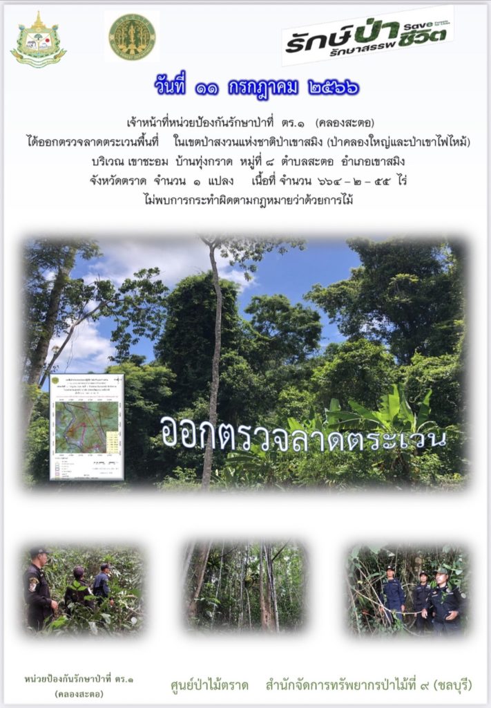 วันที่ 11 กรกฎาคม 2566 เจ้าหน้าที่หน่วยป้องกันรักษาป่าที่ ตร.1 (คลองสสะตอ) ได้ออกตรวจลาดตระเวนพื้นที่ ในเขตป่าสงวนแห่งชาติป่าเขาสมิง (ป่าคลองใหญ่และป่าเขาไฟไหม้) บริเวณเขาชะอม บ้านทุ่งกราด หมู่ที่ 8 ตำบลสะตอ อำเภอเขาสมิง จังหวัดตราด จำนวน 1 แปลง เนื้อที่ 664-2-55 ไร่ ไม่พบการกระทำผิดตามกฎหมายว่าด้วยการป่าไม้