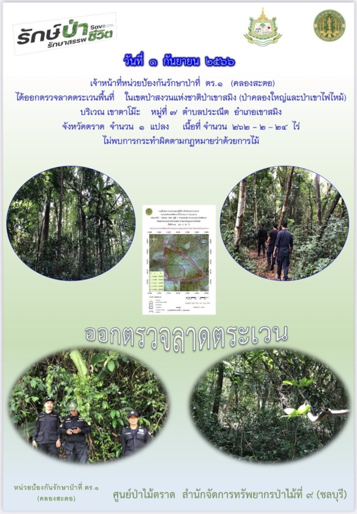 เจ้าหน้าที่หน่วยป้องกันรักษาป่าที่ ตร.1 (คลองสะตอ) ได้ออกตรวจลาดตระเวนพื้นที่ในเขตป่าสงวนแห่งชาติป่าเขาสมิง (ป่าคลองใหญ่และป่าเขาไฟไหม้) บริเวณเขาตาโม๊ะ หมู่ที่ 7 ตำบลประณีต อำเภอเขาสมิง จังหวัดตราด จำนวน 1 แปลง เนื้อที่ 262-2-24 ไร่ ไม่พบการกระทำผิดตามกฎหมายว่าด้วยการป่าไม้