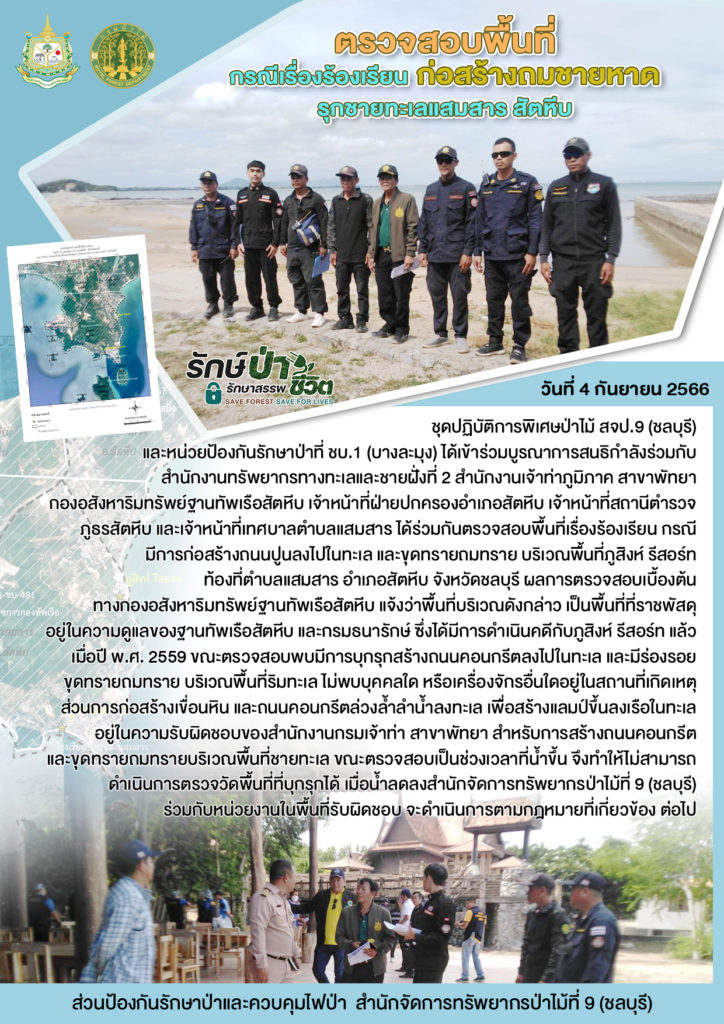 ชุดปฏิบัติการพิเศษป่าไม้ สจป.9 (ชลบุรี) และหน่วยป้องกันรักษาป่าที่ ชบ.1 (บางละมุง) ได้เข้าร่วมบูรณาการสนธิกำลังร่วมกับสำนักงานทรัพยากรทางทะเลและชายฝั่งที่ 2 สำนักงานเจ้าท่าภูมิภาค สาขาพัทยา กองอสังหาริมทรัพย์ฐานทัพเรือสัตหีบ เจ้าหน้าที่ฝ่ายปกครองอำเภอสัตหีบ เจ้าหน้าที่สถานีตำรวจภูธรสัตหีบ และเจ้าหน้าที่เทศบาลตำบลแสมสาร ได้ร่วมกันตรวจสอบพื้นที่เรื่องร้องเรียน กรณีมีการก่อสร้างถนนปูนลงไปในทะเล และขุดทรายถมทราย บริเวณพื้นที่ภูสิงห์ รีสอร์ท ท้องที่ตำบลแสมสาร อำเภอสัตหีบ จังหวัดชลบุรี ผลการตรวจสอบเบื้องต้นทางกองอสังหาริมทรัพย์ฐานทัพเรือสัตหีบ แจ้งว่าพื้นที่บริเวณดังกล่าว เป็นพื้นที่ที่ราชพัสดุอยู่ในความดูแลของฐานทัพเรือสัตหีบ และกรมธนารักษ์ ซึ่งได้มีการดำเนินคดีกับภูสิงห์ รีสอร์ท แล้ว เมื่อปี พ.ศ. 2559 ขณะตรวจสอบพบมีการบุกรุกสร้างถนนคอนกรีตลงไปในทะเล และมีร่องรอยขุดทรายถมทราย บริเวณพื้นที่ริมทะเล ไม่พบบุคคลใด หรือเครื่องจักรอื่นใดอยู่ในสถานที่เกิดเหตุ ส่วนการก่อสร้างเขื่อนหินและถนนคอนกรีตล่วงล้ำลำน้ำลงทะเล เพื่อสร้างแลมป์ขึ้นลงเรือในทะเลอยู่ในความรับผิดชอบของสำนักงานกรมเจ้าท่า สาขาพัทยา สำหรับการสร้างถนนคอนกรีตและขุดทรายถมทรายบริเวณพื้นที่ชายทะเล ขณะตรวจสอบเป็นช่วงเวลาที่น้ำขึ้น จึงทำให้ไม่สามารถดำเนินการตรวจวัดพื้นที่ที่บุกรุกได้ เมื่อน้ำลดลงสำนักจัดการทรัพยากรป่าไม้ที่ 9 (ชลบุรี) ร่วมกับหน่วยงานในพื้นที่รับผิดชอบ จะดำเนินการตามกฎหมายที่เกี่ยวข้องต่อไป