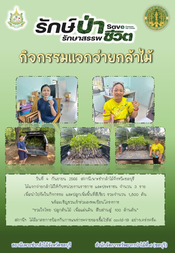 สถานีเพาะชำกล้าไม้จังหวัดชลบุรี ได้แจกจ่ายกล้าไม้ให้กับหน่วยงานราชการ และประชาชน 2 ราย เพื่อนำไปจัดกิจกรรม และปลูกเพิ่มพื้นที่สีเขียว รวมจำนวน 1,800 ต้น พร้อมเชิญชวนเข้าร่วมลงทะเบียนโครงการ “รวมใจไทย ปลูกต้นไม้ เพื่อแผ่นดิน สืบสานสู่ 100 ล้านต้น”