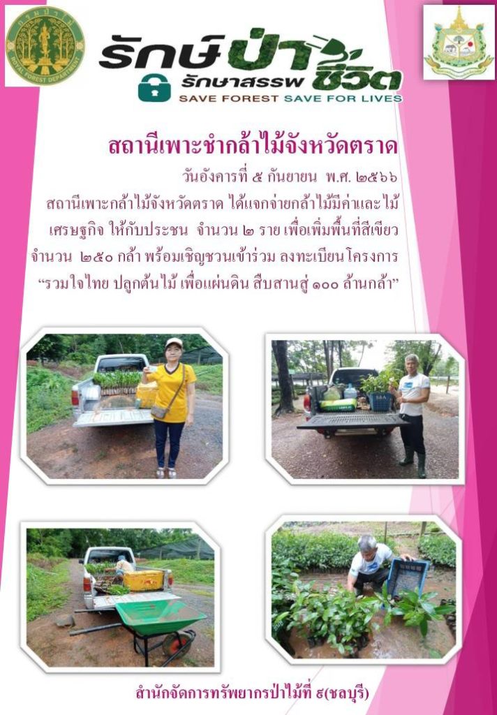 สถานีเพาะชำกล้าไม้จังหวัดตราด ได้แจกจ่ายกล้าไม้มีค่าและไม้เศรษฐกิจ ให้กับประชาชน 2 ราย เพื่อเพิ่มพื้นที่สีเขียว จำนวน 250 กล้า พร้อมเชิญชวนเข้าร่วมลงทะเบียนโครงการ “รวมใจไทย ปลูกต้นไม้ เพื่อแผ่นดิน สืบสานสู่ 100 ล้านต้น”