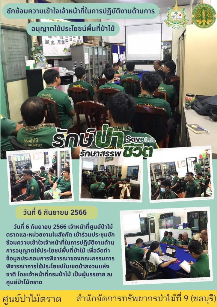 เจ้าหน้าที่ศูนย์ป่าไม้ตราดและหน่วยงานในสังกัด เข้าร่วมประชุมซักซ้อมความเข้าใจเจ้าหน้าที่ในการปฏิบัติงานด้านการอนุญาตใช้ประโยชน์พื้นที่ป่าไม้ เพื่อจัดทำข้อมูลประกอบการพิจารณาของคณะกรรมการพิจารณาการใช้ประโยชน์ในเขตป่าสงวนแห่งชาติ โดยเจ้าหน้าที่กรมป่าไม้ เป็นผู้บรรยาย ณ ศูนย์ป่าไม้ตราด