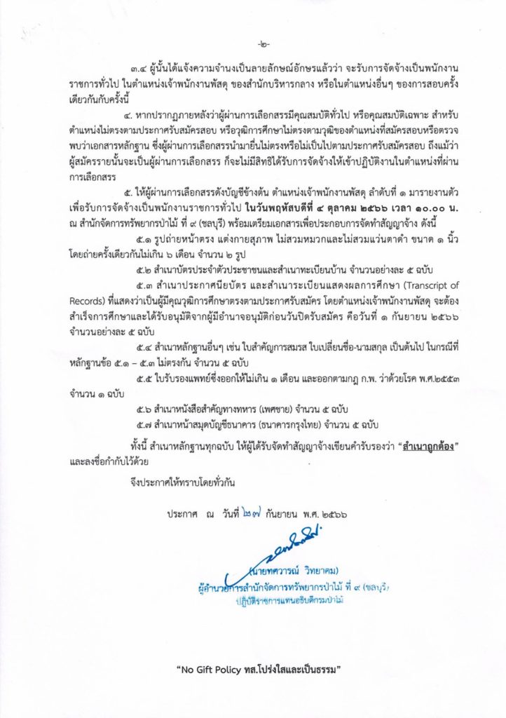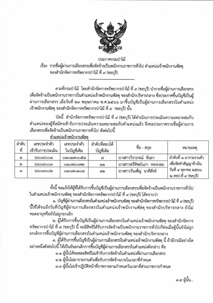 ประกาศกรมป่าไม้ เรื่อง รายชื่อผู้ผ่านการเลือกสรรเพื่อจัดจ้างเป็นพนักงานราชการทั่วไป ตำแหน่งเจ้าพนักงานพัสดุ ของสำนักจัดการทรัพยากรป่าไม้ที่ 9 (ชลบุรี) ประกาศ ณ วันที่ 27 กันยายน พ.ศ. 2566
